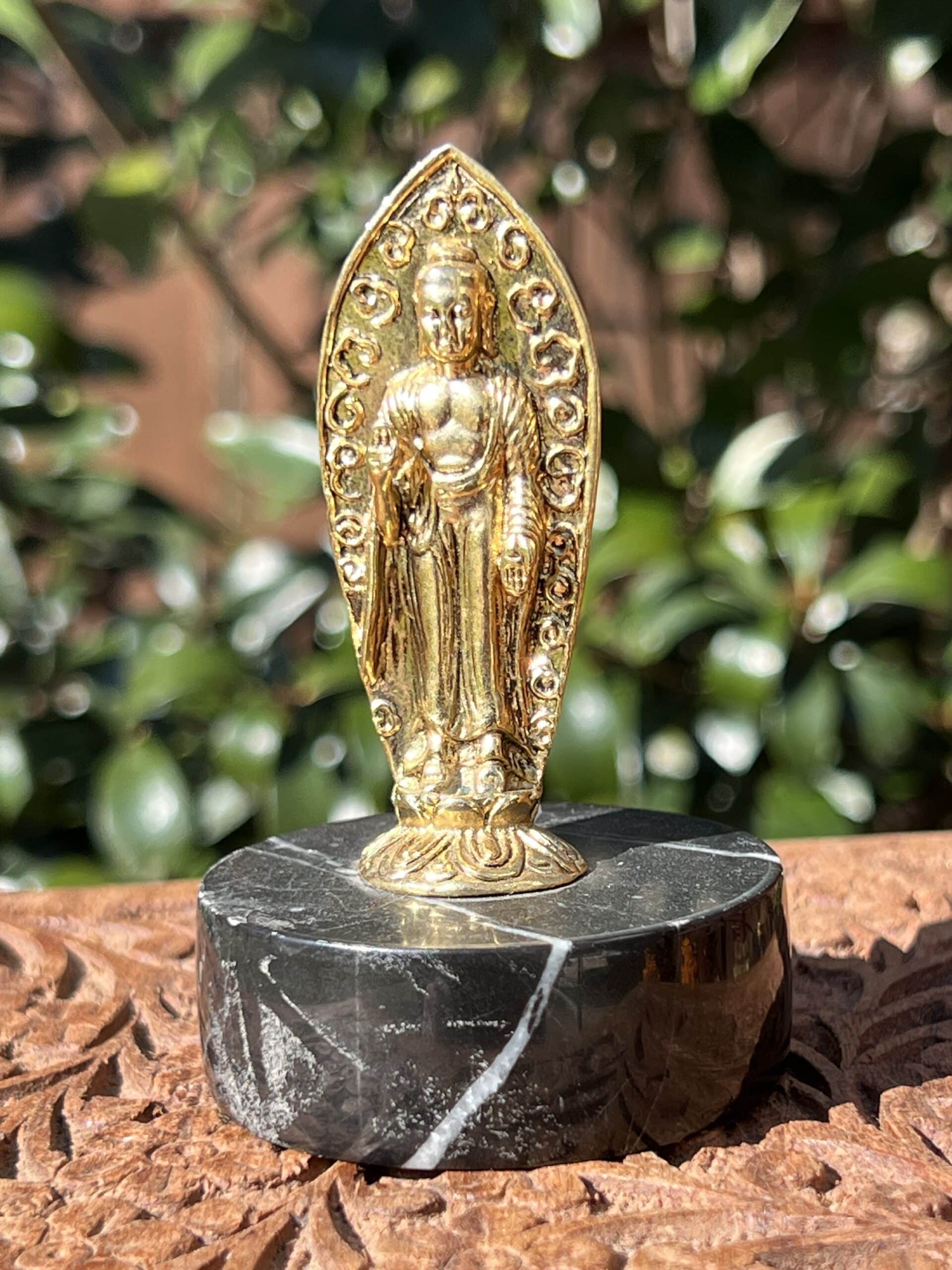 24 KT Gold Guilded Buddha on zebra marble statue measures 3 1/8 x 2 x 2″ and weighs 4.5 ounces.