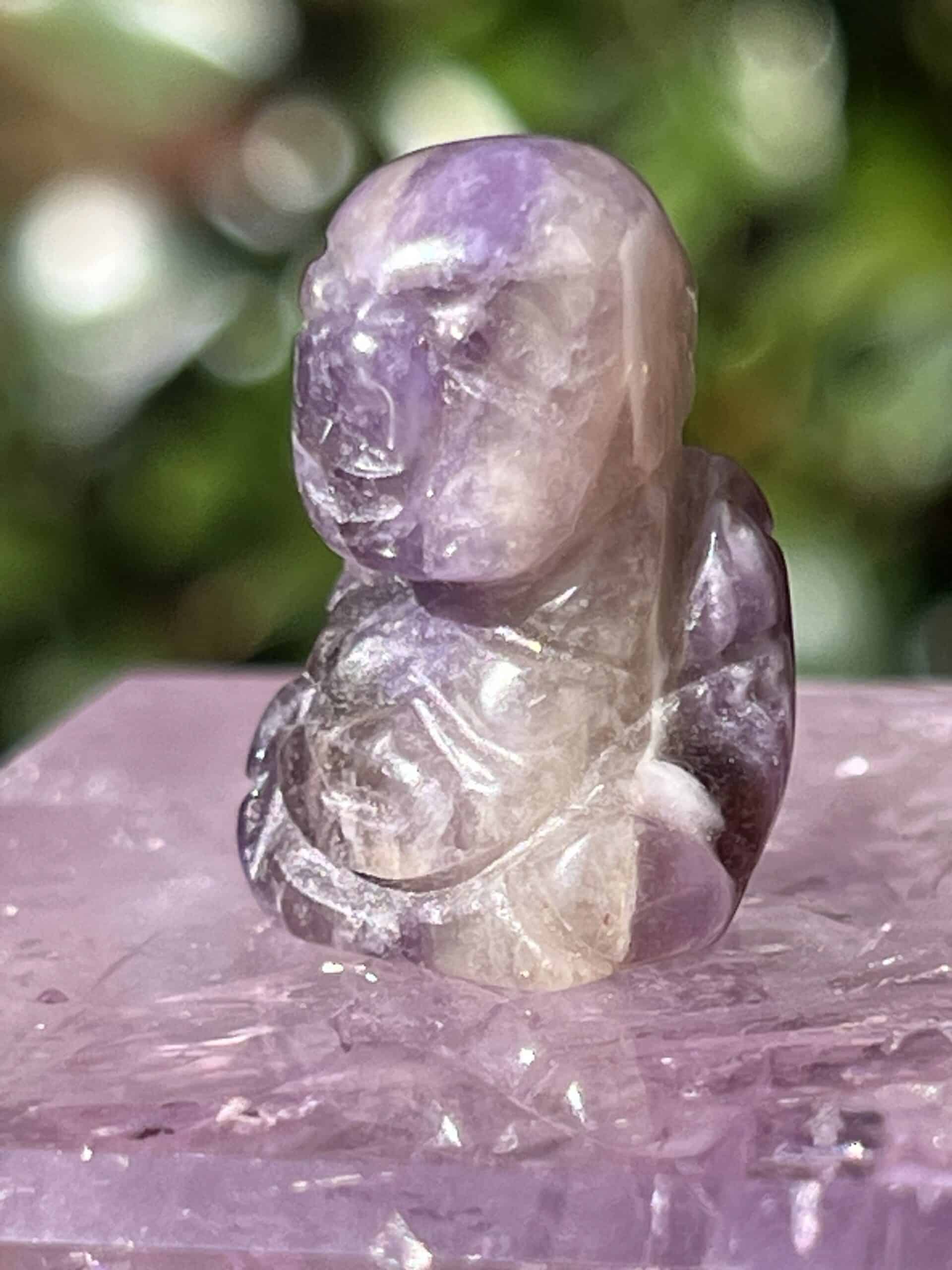 Amethyst stone small Buddha statue measures 16 cm x 12 cm x 7 cm, and weighs 1/8 of an ounce.